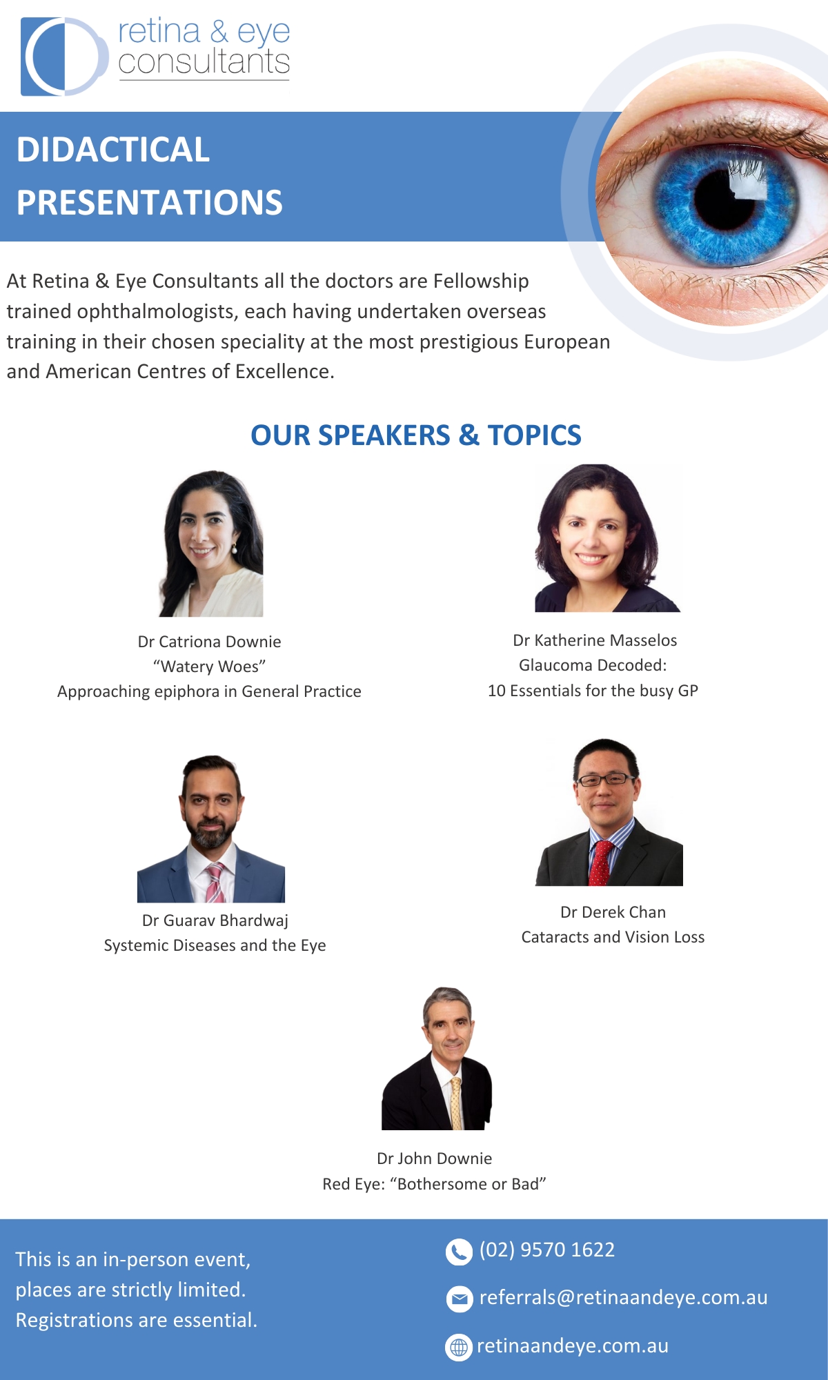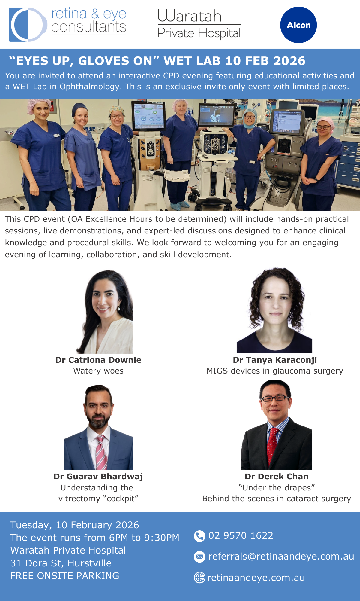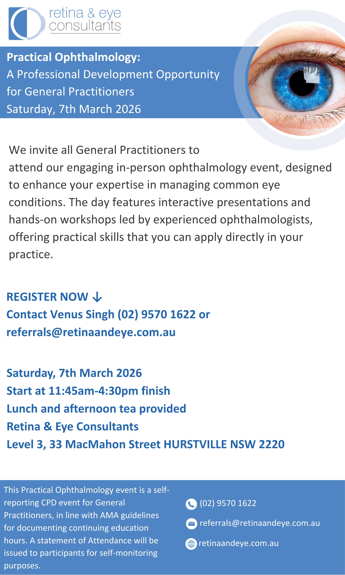 Please register your interest with Venus on (02) 9570 1622 or email: referrals@retinandeye.com.au and we will keep you updated with our future workshops.